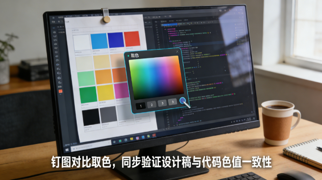 此外,钉图适合做多端一致性检查。移动端与网页端常出现同一品牌色在不同背景下显得不一致的情况。把两端截图钉在一起,再配合取色对比,差异来源更容易定位。
