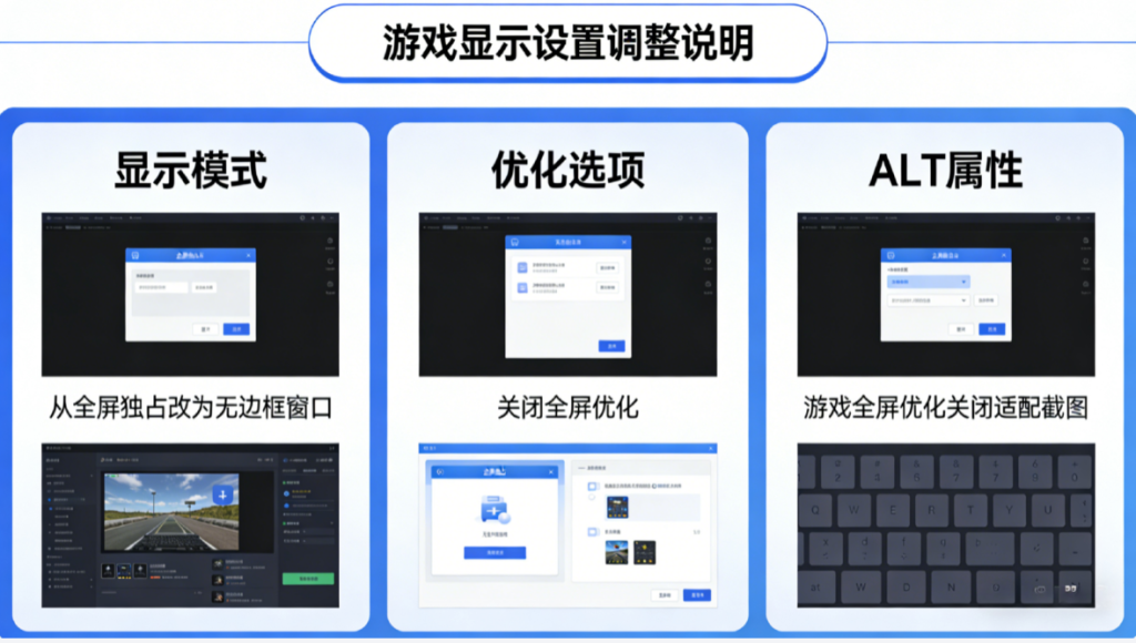 • 同时,如果黑屏只在“截全屏/截游戏”时出现,而截窗口正常,优先怀疑全屏模式与叠加层。