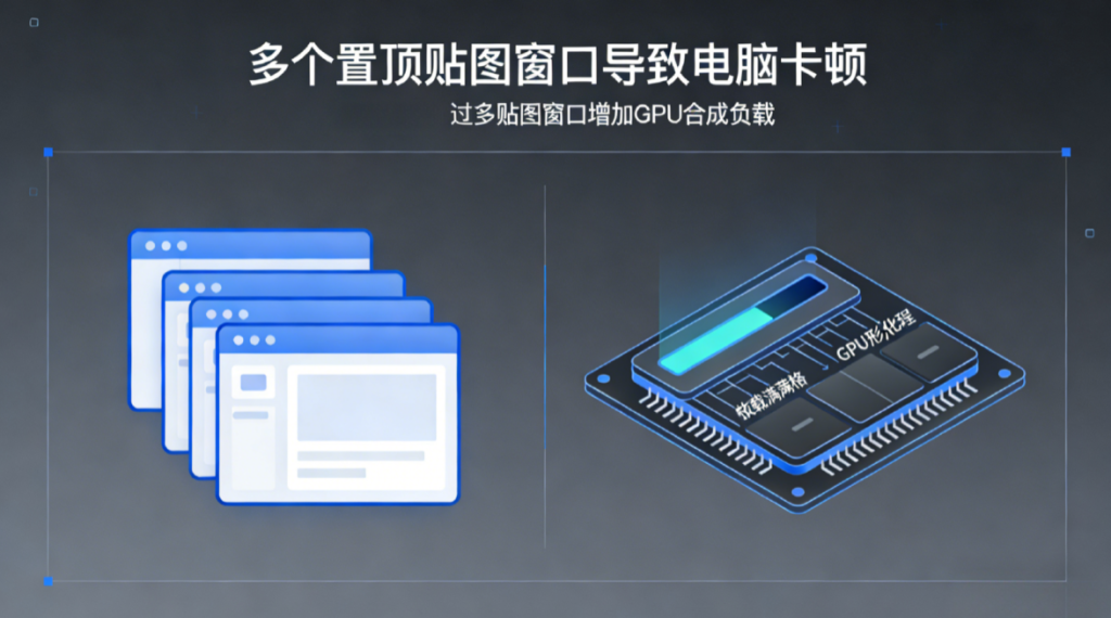 贴图本质上是多个置顶窗口。数量多、透明度高、频繁缩放时,GPU 合成开销会上升。因此,按分组及时关闭、减少动画与缩放操作,会更稳。