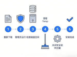 再按原因分层修复:下载完整性、权限拦截、系统组件、磁盘与临时目录逐项排除。