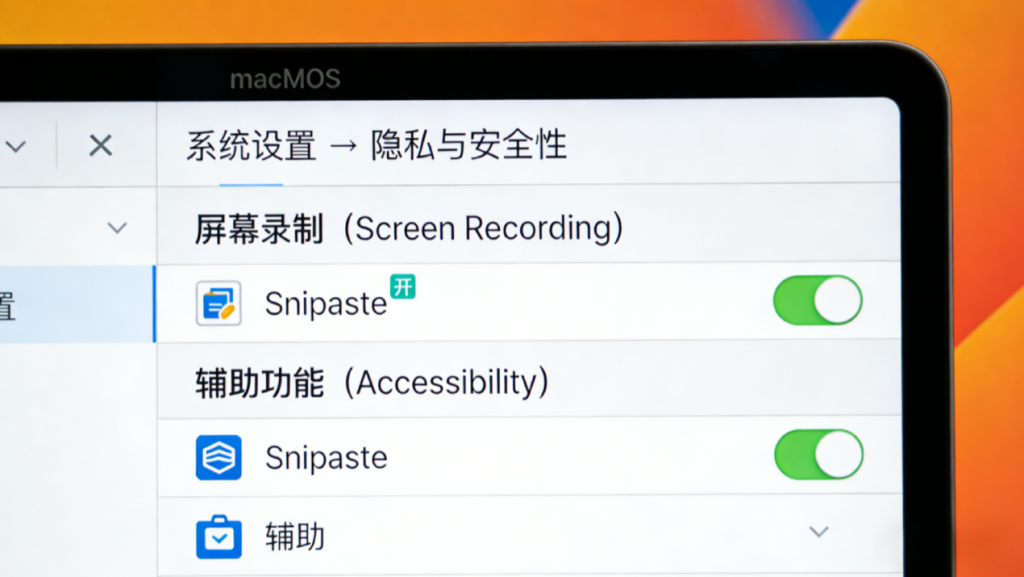 - 进入 Screen Recording(屏幕录制),确认 Snipaste 已允许。